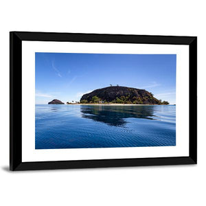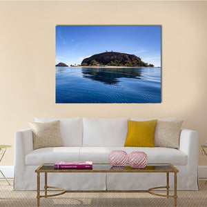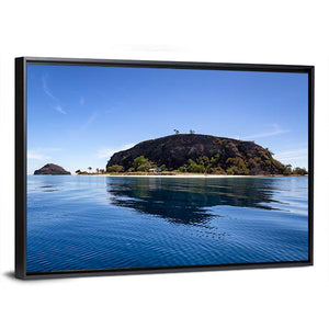 Photographic canvas of a tropical island and small sandy beach, captured in a low-angle, wide view with rippling blue water and trees on the island summit beneath a clear blue sky. The scene feels serene, idyllic, and sunny, with realistic tones of blue, green, brown, and white. It works well in coastal or modern room decor.