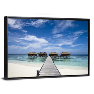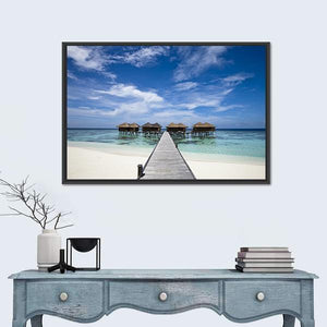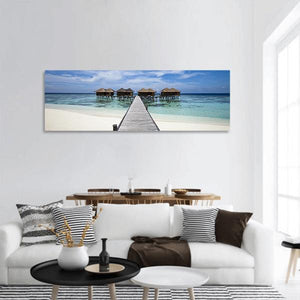 A photorealistic panoramic view of a tropical beach with white sand, crystal-clear turquoise water, a pier leading to overwater bungalows, and a clear blue sky with clouds. The scene reads calm and peaceful, a serene tropical escape. Fits well in modern or coastal-inspired rooms and nature-focused decor.