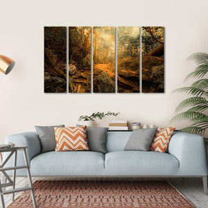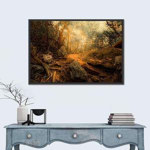 This captivating piece showcases a serene forest path with exposed tree roots and large boulders, all bathed in warm sunlight filtering through the canopy. Its inviting tones of brown, green, and orange create a tranquil atmosphere, perfect for nature lovers.