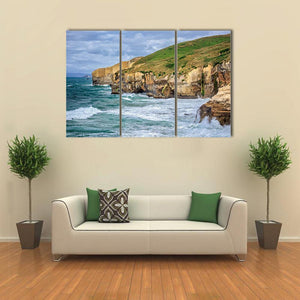 This canvas shows coastal cliffs and ocean waves in a wide, rule-of-thirds composition. The realistic scene pairs dramatic rock formations and turbulent, crashing waves with a calm, serene mood in blue, green, tan, white and grey tones. It suits modern or coastal-inspired interiors and room decor.