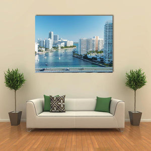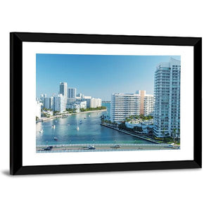 An aerial view of Venetian Way and Miami Beach featuring high-rise buildings, a bridge with cars, and boats on the water. The realistic, modern print uses blue, white, green and brown for a bright, serene urban mood. It suits modern living rooms and coastal-inspired spaces.