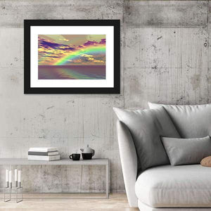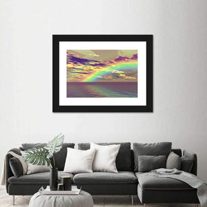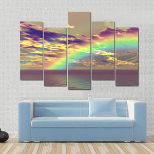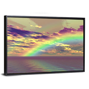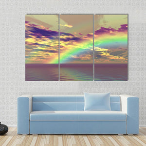 This captivating canvas captures a vibrant rainbow arching over serene clouds and the ocean, evoking a hopeful and ethereal atmosphere. The rich palette of purples, yellows, greens, and blues blends beautifully, making it an ideal piece for any modern decor.