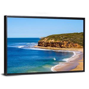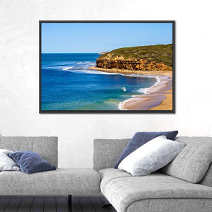View Of Bells Beach Canvas Wall Art presents the ocean, sandy beach and vegetated cliffs in a rule-of-thirds layout, highlighting gentle waves and natural shoreline textures. The blue, tan and green palette gives a serene yet vibrant coastal feel. It works well in modern or nature-inspired rooms that favor calm, natural scenery.