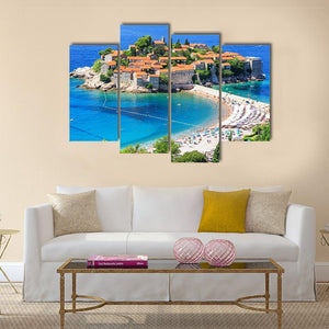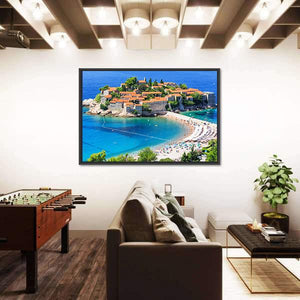 This captivating landscape canvas art features an aerial perspective of Sveti Stefan Island, showcasing the tranquil beach and vibrant ocean. The serene hues of blue, orange, and green create an idyllic atmosphere, perfect for any coastal-themed decor.