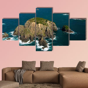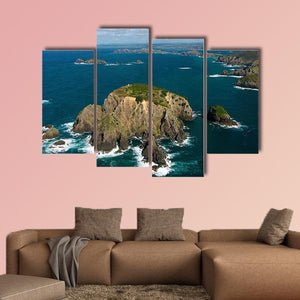 A photorealistic, aerial view of the Cavalli Islands—rocky cliffs, islands and a lone lighthouse framed by white wave foam. Deep blues, teals and earthy browns give the scene a dramatic yet serene, vast feeling. Suits modern or coastal-inspired rooms and any space that favors nature-focused art.