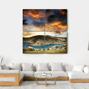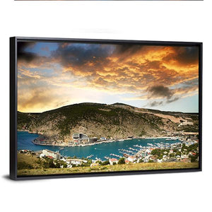 This landscape artwork captures a serene harbor scene framed by majestic mountains and a vibrant sky. With boats gently docked and dramatic clouds overhead, it invites a mix of calmness and vibrancy into your space.