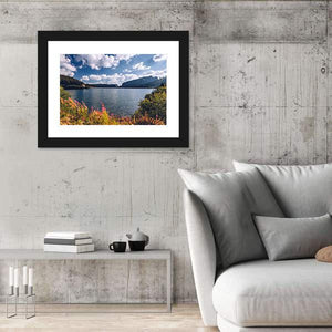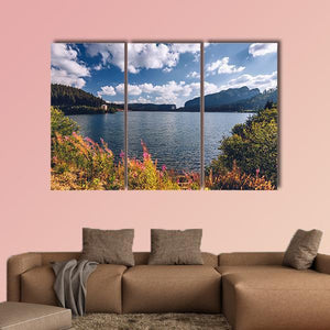 A realistic, photographic landscape of Bolboci Lake with mountains, dramatic clouds and wildflowers in the foreground. Soft blues, greens, pinks and white create a serene, vibrant, majestic atmosphere that works well in modern or nature-inspired rooms.