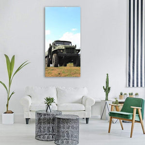 An up-close canvas print of a vintage military truck seen from a low angle against a vast sky. The realistic image uses greens, blues, browns and white highlights to convey a powerful, rugged presence, with large tires, grill and windshield in clear detail. It complements rustic or industrial-inspired room decor and works as a bold vintage wall piece.