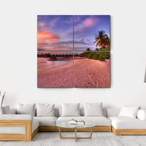 This striking canvas captures a serene tropical beach at sunset, featuring overwater bungalows silhouetted against a vibrant sky. Hues of pink, purple, and orange reflect in the tranquil waters, creating a romantic atmosphere that enhances any space.