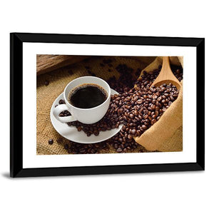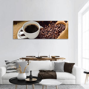 This close-up, realistic image shows a white cup of dark coffee beside roasted beans spilling from a burlap sack with a wooden scoop, rendered in warm brown, tan, and white tones. The photograph-like canvas feels aromatic and inviting and works well in a kitchen, dining room, or cafe-style wall display.