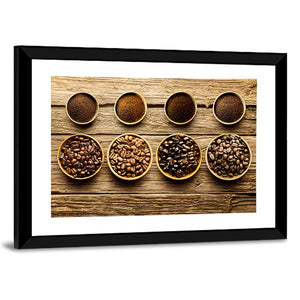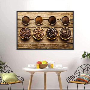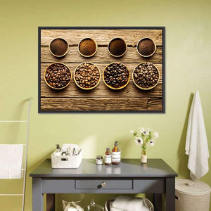 This panoramic canvas features coffee beans and coffee grounds arranged in eight bowls with a symmetrical composition and a warm brown, tan, and black palette. The piece has a rustic, organic mood that fits kitchens, coffee bars, or modern-rustic living spaces.