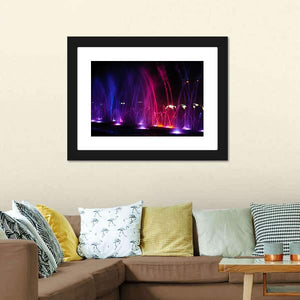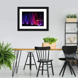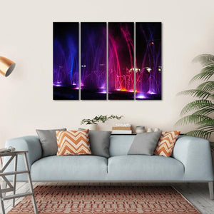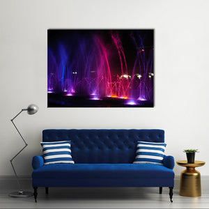 Experience the vibrant interplay of light and water with the Dancing Fountains At Night canvas wall art. This colorful piece depicts illuminated fountains, showcasing streams of water aglow in shades of blue, purple, pink, and orange. Its dynamic design adds a magical touch to any space.