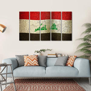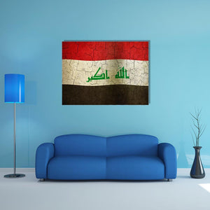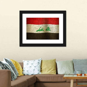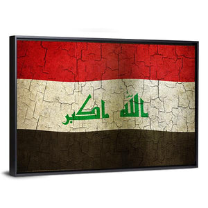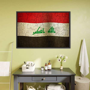 Celebrate the bold heritage of Iraq with this striking flag canvas wall art. Featuring a rich color palette of red, white, black, and green, it captures a historic and patriotic essence. The textured design, adorned with Arabic script and a cracked paint effect, makes it a meaningful addition to any space.