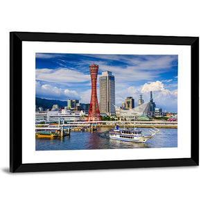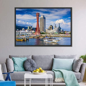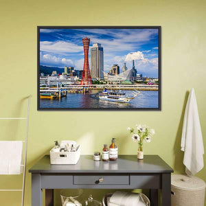 Japan City Skyline Vertical Canvas Wall Art captures a photorealistic waterfront scene with the red Kobe Port Tower, tall buildings, and a boat under a clear blue sky. The bright red, blue, white, gray, and green palette gives the piece a vibrant, urban energy that suits modern living rooms and contemporary offices.