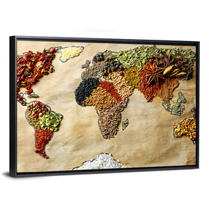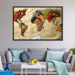 This canvas wall art features an abstract world map composed entirely of different spices. With a palette of earthy tones and vibrant colors, it adds a creative and culinary touch to any space.