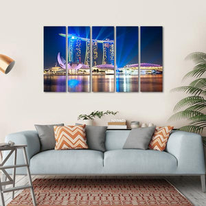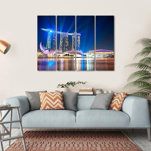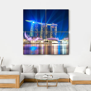 Experience the vibrant cityscape of Singapore with this captivating canvas print. Featuring the Marina Bay Sands hotel complex against a backdrop of colorful lights reflecting on water, this artwork captures a modern, urban mood that adds energy to any space.