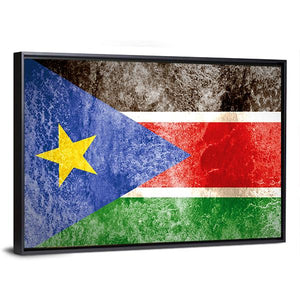 This panoramic canvas features the South Sudan national flag rendered in a bold, graphic style that highlights the prominent yellow star and the flag’s blue, red, green, yellow, and black palette. A symmetric composition and worn texture effect give it a distressed, modern feel that suits graphic interiors and patriotic spaces.