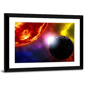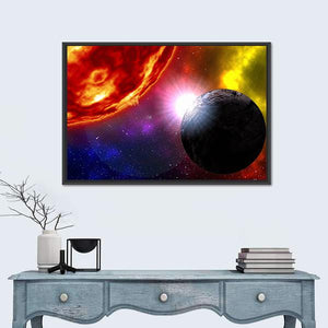 This vibrant canvas art captures a glowing sun rising over a dark planet amidst a beautiful nebula. The cosmic palette features rich reds, oranges, and purples, creating a mysterious atmosphere perfect for any space enthusiast.