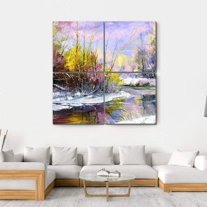 This canvas art features a serene winter landscape showcasing a tranquil river meandering through snowy trees. The gentle palette of yellow, purple, white, and brown evokes a peaceful and cold atmosphere, perfect for enhancing any wall in your home.