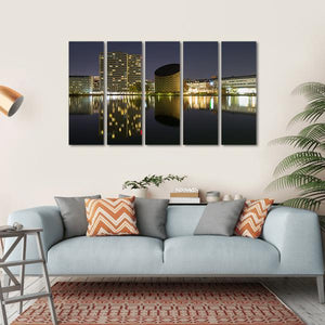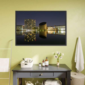 This canvas wall art captures the vibrant skyline of Copenhagen at night, showcasing modern architecture along the waterfront. The calming palette of dark blue, yellow, and white enhances the serene reflections of illuminated buildings in the water.
