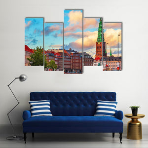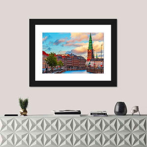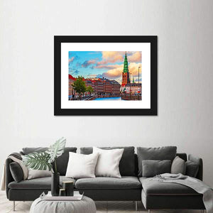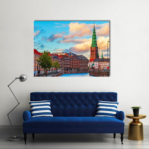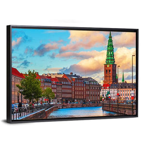 This vibrant canvas captures the picturesque summer sunset over Copenhagen's enchanting old town. Featuring a stunning green spire church tower and a row of colorful buildings, it brings the charm of Danish cityscapes into your space.
