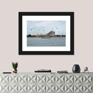 View On The Incinerator Of Copenhagen shows a realistic riverside scene centered on a power plant with smokestacks, a sloping-roof building and a long narrow boat. Rendered in blues, greys, white, brown and green with an overcast, industrial mood and a rule-of-thirds composition, it suits modern or industrial living spaces and offices.