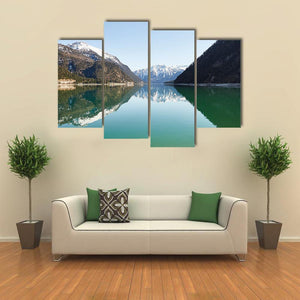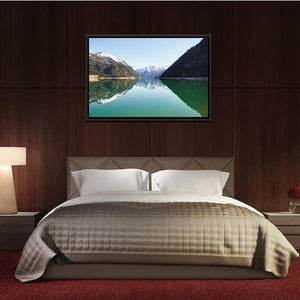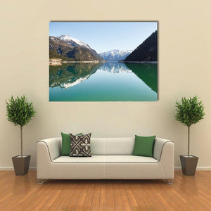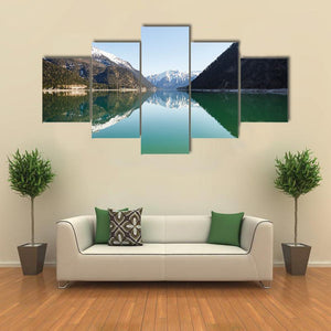 This canvas depicts Achensee Lake in Austria with snow-capped mountains and a clear blue sky mirrored in calm water. The realistic, symmetrical landscape feels serene and majestic. It pairs well with modern home decor and calm interiors.