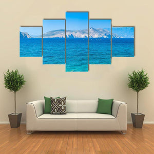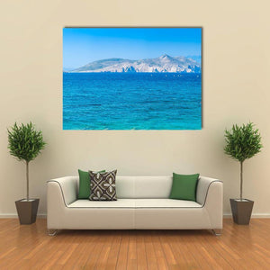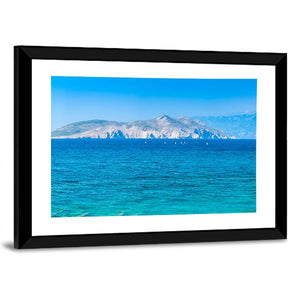 A calm seascape of the Adriatic around Krk, Croatia, showing clear blue water, a rocky coastline, distant mountains and a few small boats. The image uses a modern rule-of-thirds composition and a blue, white, green and grey palette to create a serene, tranquil mood that suits coastal or modern room decor.