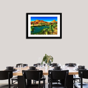 African Oasis Panoramic Canvas captures a serene desert oasis with palm trees, distant mountains, and water reflecting the sky. The vibrant, realistic colors—browns, greens, blues and touches of yellow—create a calm daytime landscape. Suited to modern rooms and living spaces that favor landscape art.