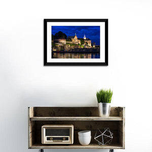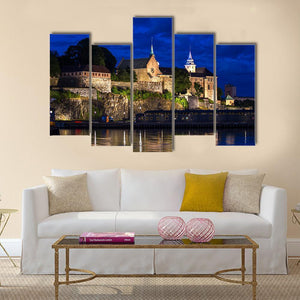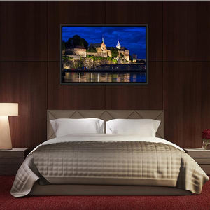 Akershus Fortress And Castle Canvas Wall Art shows the fortress and castle on a nighttime waterfront, with castle lights and water reflections that create a dramatic yet calm mood. The photorealistic cityscape uses blue, brown, grey and golden tones and a layered composition that emphasizes depth. It suits modern interiors and complements room decor seeking atmospheric urban scenes.