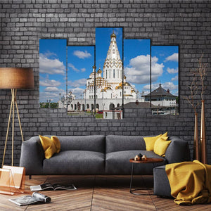 Capture the majestic beauty of the All Saints Church in Minsk with this striking canvas print. Featuring multiple gold domes against a serene blue sky and soft clouds, this artwork brings a sense of tranquility and spirituality to any space.