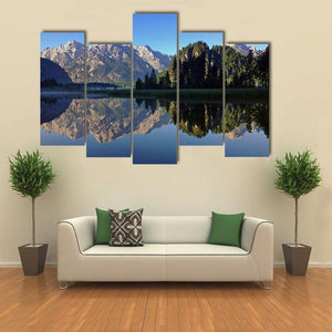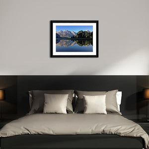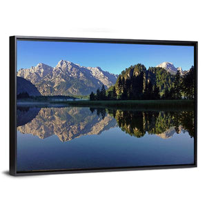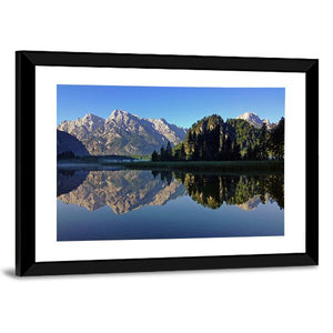 Almsee in Austria shows snow-capped peaks, pine trees and a calm lake that mirrors the mountains and trees. Rendered in a realistic nature style with blue, green, white and brown tones, it creates a serene, majestic mood that fits modern home decor such as a living room or study.