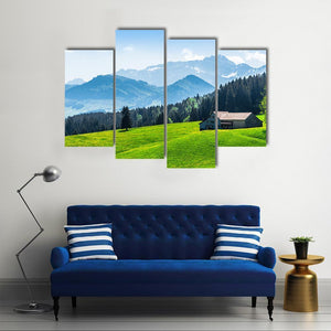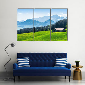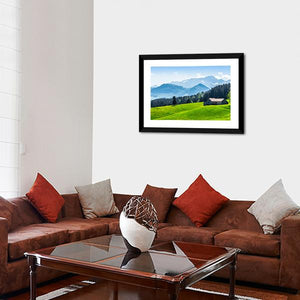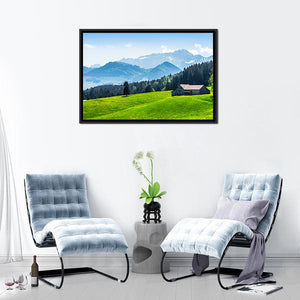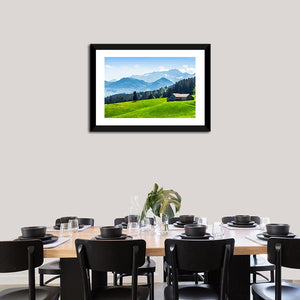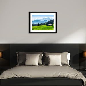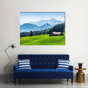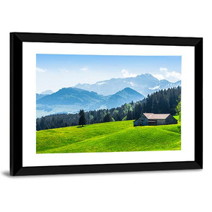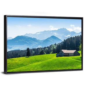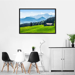 Alpine Landscape With Saentis Peak shows a peaceful alpine scene with snow-capped mountains, pine forest, a small house with a dark roof, and a grassy hill dotted with yellow wildflowers. The green and blue palette and scenic nature feel suit living rooms or bedrooms seeking a calm, nature-inspired focal point.