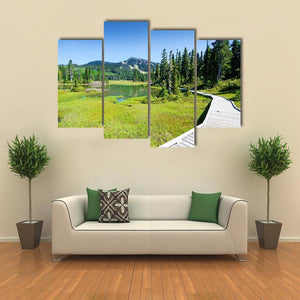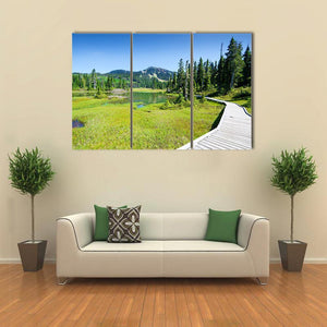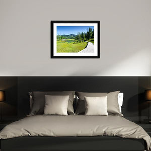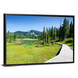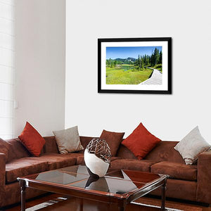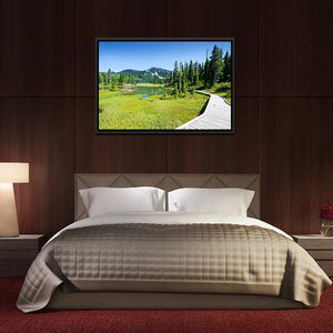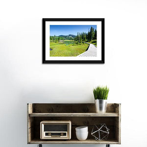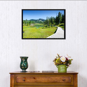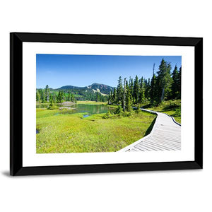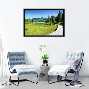 Alpine Trail In Canada shows a wooden boardwalk curving past a grassy marsh and calm lake toward snow-capped mountains. The photorealistic landscape uses green and blue tones to create a serene, natural mood that suits modern home wall decor.