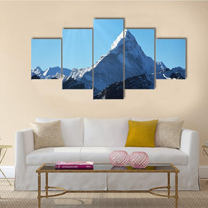 This canvas art showcases the breathtaking Ama Dablam mountain range, featuring stunning snow-capped peaks and sun rays breaking through in a serene blue and white palette. Its majestic landscape captures the essence of nature, making it a perfect addition to your wall decor.