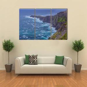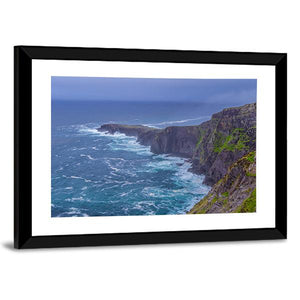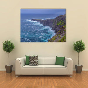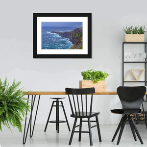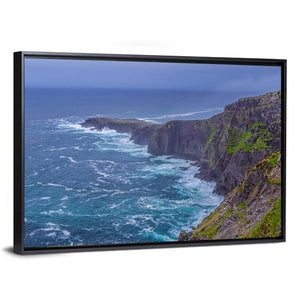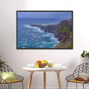 Fogher Cliffs Canvas Wall Art depicts rugged coastal cliffs and foaming ocean waves beneath an overcast sky. The realistic landscape uses blue, green, grey, and white tones with a sweeping diagonal perspective to convey a dramatic, wild mood. Suits modern or coastal-inspired home rooms.
