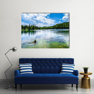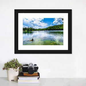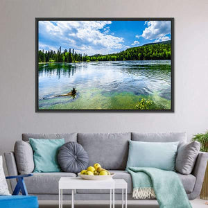 Clear Water Lake in Canada captures a serene lakeside landscape with clear shallow water, visible rocks and vegetation, and a partially submerged log beneath puffy white clouds. Rendered in a realistic style with blue, green, white and brown tones, the print brings a calm, natural feel that fits modern living spaces and room decor.