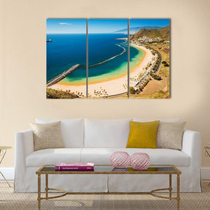 Beach Las Teresitas Canvas Wall Art shows an aerial, wide-angle view of a sunny beach and coastline with breakwater structures, palm trees, and buildings on the hills. The photorealistic, vibrant palette of blue, white, tan, green, and yellow creates a serene, sunny mood that works well with modern or coastal room decor.