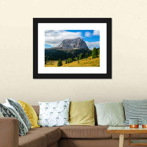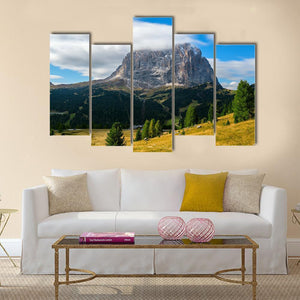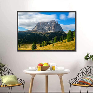 A realistic landscape of the Dolomites in Italy showing a partially cloudy mountain peak, dense pine forest and grassy meadow. The composition uses depth and the rule of thirds to create a serene, majestic, and vast atmosphere suited to modern living rooms, bedrooms, or home offices.