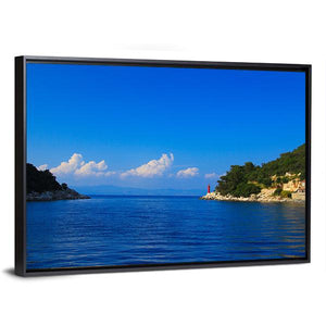 Lake In Croatia Canvas Wall Art captures a serene, bright coastal scene in Croatia with a lake, islands, a small red lighthouse and white buildings on a hill. Rendered in a vibrant, photorealistic style with blues, greens and fluffy white clouds, it works well in coastal or modern room decor.
