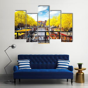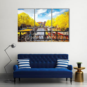 This vibrant canvas art depicts Amsterdam's serene canals framed by yellow foliage and charming houses. With bicycles resting on a bridge, it captures the essence of urban autumn beauty.