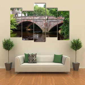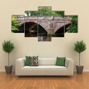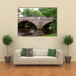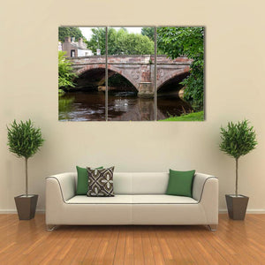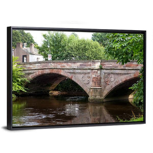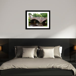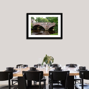This canvas features a serene stone bridge arching over a flowing river, framed by lush trees. The earthy palette of browns and greens adds a natural touch, creating a peaceful atmosphere ideal for any space needing a calming view.