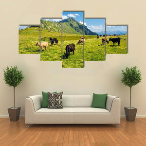 Cows grazing across a lush alpine meadow, framed by jagged mountain peaks and fluffy white clouds. The green, blue and brown palette gives a peaceful, idyllic feel that works well in rustic or nature-inspired rooms.