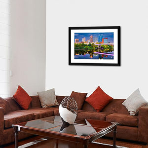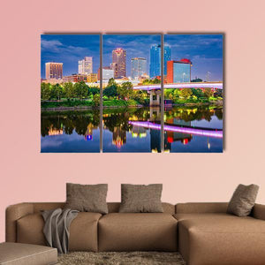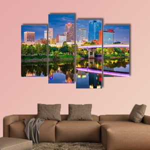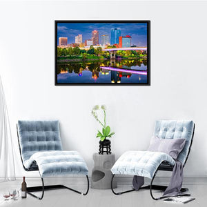 Arkansas Skyline Canvas Wall Art shows a realistic city skyline with an illuminated bridge and centered river reflections at dusk, painted in blues, greens, orange, purple and white. Its vibrant, reflective evening mood pairs well with modern room decor and home interiors.