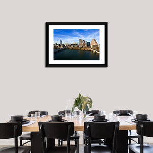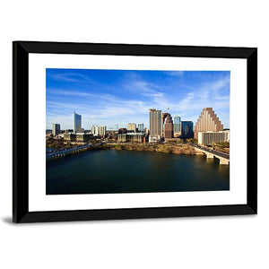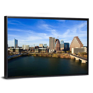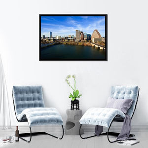 Austin Downtown captures the city skyline, river and multiple bridges in a wide panoramic view. The modern palette of blue, brown, gray and white creates a bright, urban, and expansive mood that fits contemporary living rooms and offices.