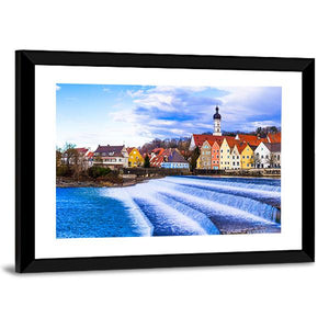 Landsberg Am Lech Panoramic Canvas captures a peaceful, vibrant riverside village with a tiered waterfall, steepled church tower, and clustered buildings. Rendered in a realistic style with blues, yellows, whites, and greens, the panoramic scene offers calm, daylight clarity. It suits modern interiors as a serene architectural landscape focal point.