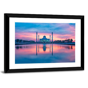 A panoramic photographic print of a mosque at sunset, with a symmetrical reflection across calm lake waters in soft pinks, blues, purples and warm orange tones. The image feels serene and spiritual, and suits modern living rooms, meditation corners, or prayer spaces that favor tranquil wall art.