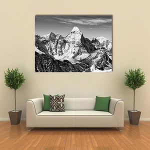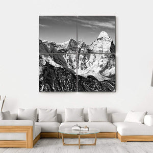 This canvas wall art captures the striking beauty of the Ama Dablam mountain range in Nepal. Its dramatic black and white palette features majestic snowy peaks and rocky slopes under a serene sky filled with streaky clouds, creating a truly grand atmosphere.