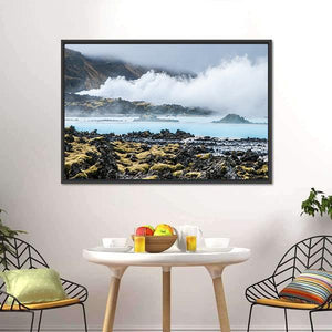 This canvas art captures the serene beauty of geothermal springs and moss-covered rocks in Iceland. Featuring vibrant blue water and billowing steam from surrounding mountains, it creates an otherworldly atmosphere perfect for your space.