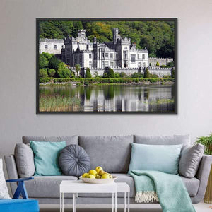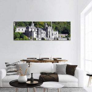Kylemore Abbey, Ireland captured in a photographic panoramic view of the stone castle set against dense green forest and a rocky embankment. The scene reads as majestic and serene with a quiet, historic mood. Works well with modern interiors and fits living rooms or studies.